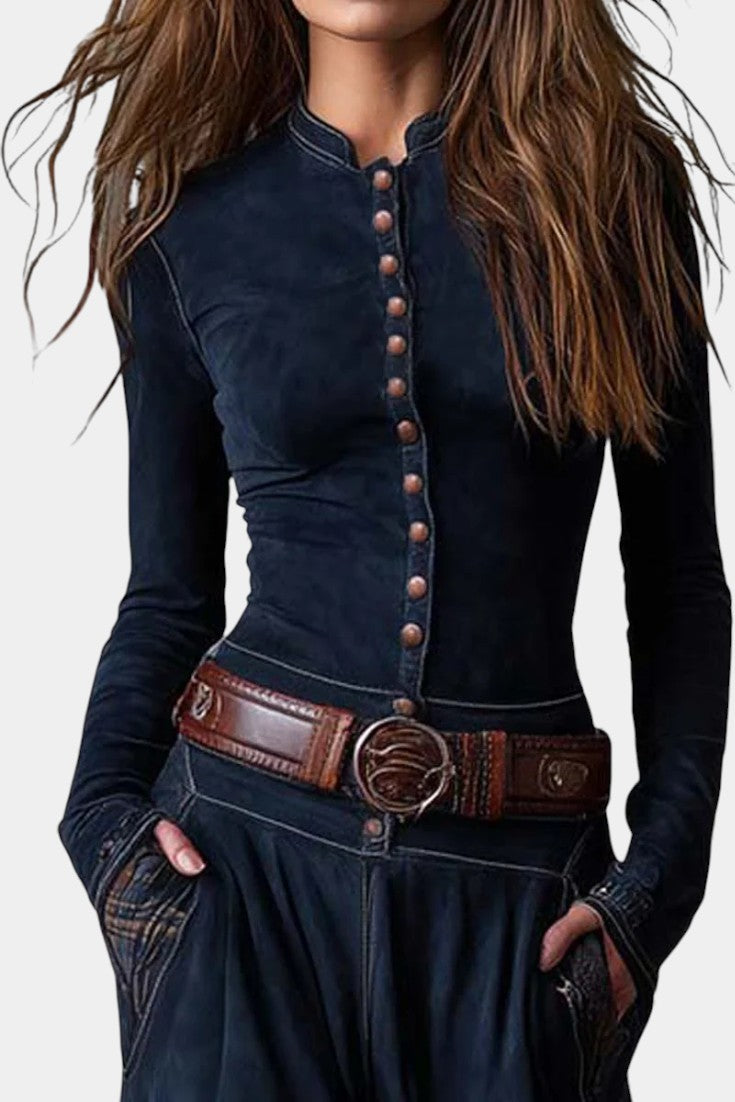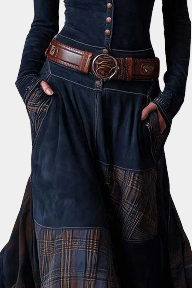 Intemporelle et pleine de caractère, la robe Marlis associe la richesse du suède écologique à l’authenticité d’un patchwork à carreaux pour une allure résolument vintage. Son corsage ajusté, souligné par un col montant et des boutons métalliques, structure la silhouette avec finesse, tandis que la jupe fluide à panneaux crée un mouvement ample et gracieux à chaque pas. L’harmonie entre les tons marine profonds et les nuances brun-bleu offre un charme retro Western revisité avec sophistication. (sans ceinture)