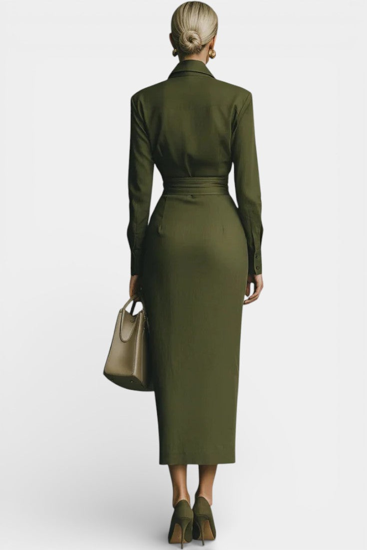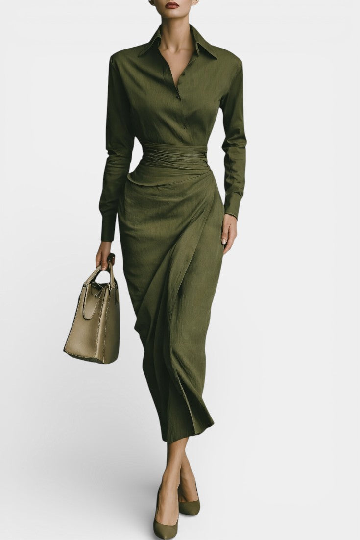 Une robe à l’élégance maîtrisée, pensée pour une allure affirmée et contemporaine. Séraphine se distingue par sa teinte vert armée profonde, sa coupe ajustée et son drapé subtil qui structure la silhouette avec précision. Le col chemise et les manches longues apportent une touche nette et sophistiquée, tandis que le design épuré laisse toute la place à la ligne et au tombé impeccable.
