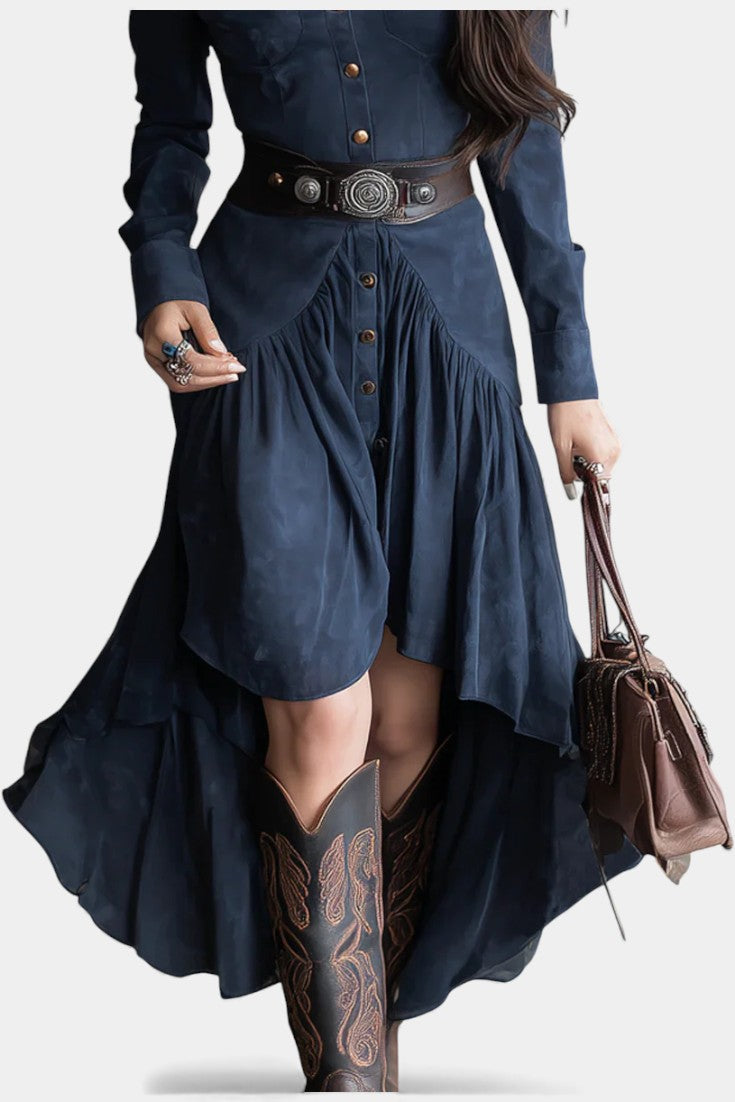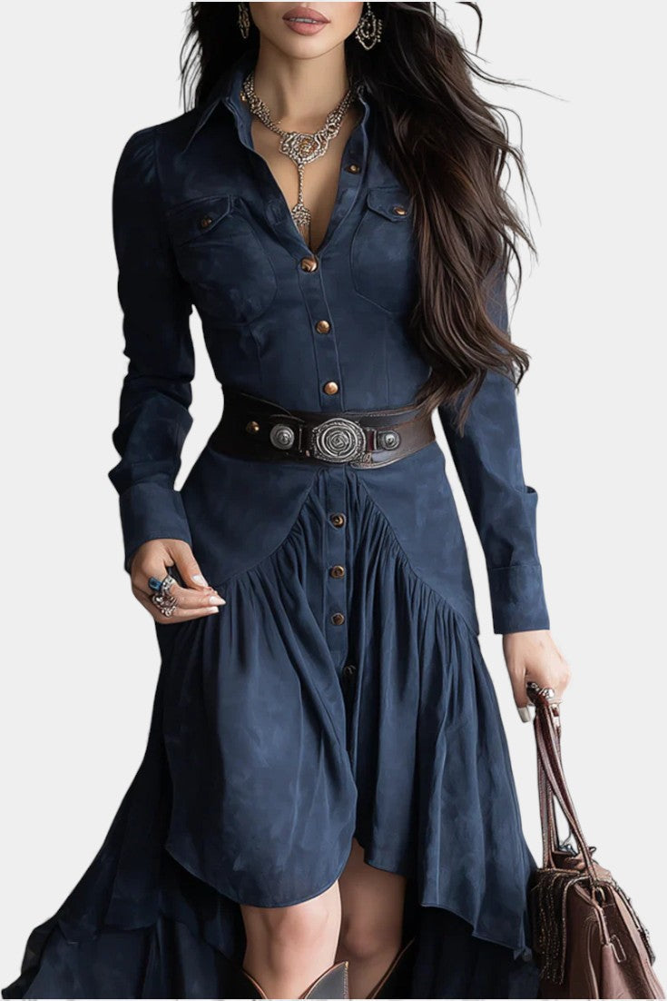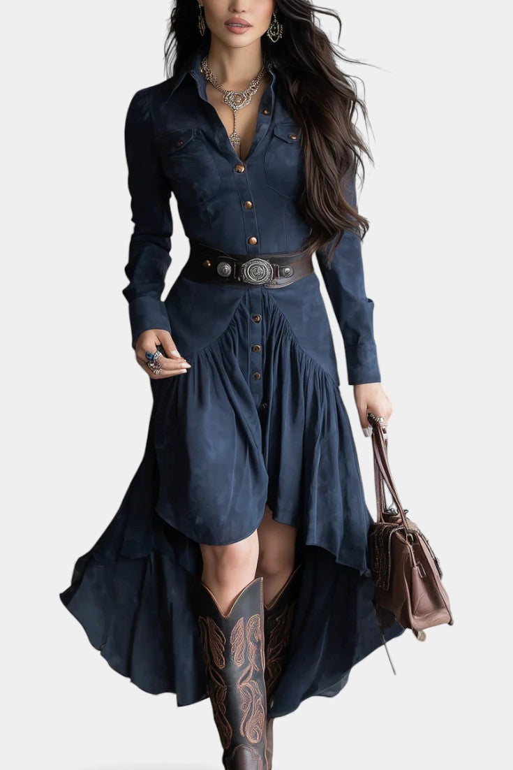 Élégante et singulière, la robe Kélia revisite le charme vintage avec une touche contemporaine. Confectionnée en daim doux et souple, elle enveloppe la silhouette avec un confort raffiné tout en affichant un style affirmé. Son ourlet asymétrique crée un mouvement naturel et moderne, tandis que les poches à rabat ajoutent une note utilitaire chic. Sa teinte bleu rétro lui donne une allure intemporelle, parfaite pour celles qui aiment se démarquer avec subtilité.